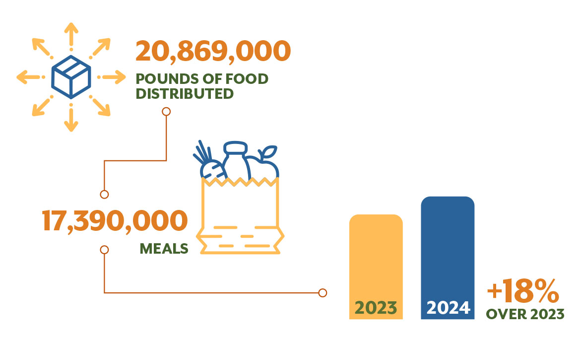 Gracias a todos nuestros donantes, socios y aliados, logramos distribuir 20,869,000 libras de alimentos, lo que significa 17,390,800 comidas distribuidas a vecinos con inseguridad alimentaria en los 78 municipios de Puerto Rico. Esto representa un aumento de 18 % sobre el 2023.